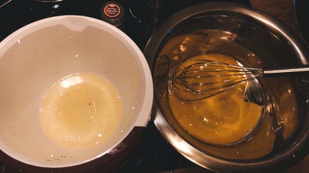 3. Anschließen fügt man zum Eigelb den Vanillezucker hinzu. zum Eiweiß kommt eine Prise Salz. Dann kann man das Eiweiß mit einem Schneebesen steif schlagen.