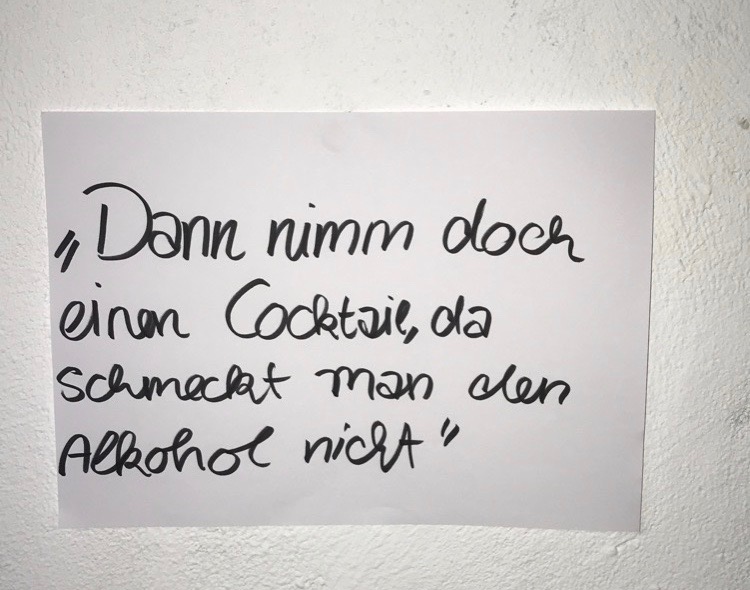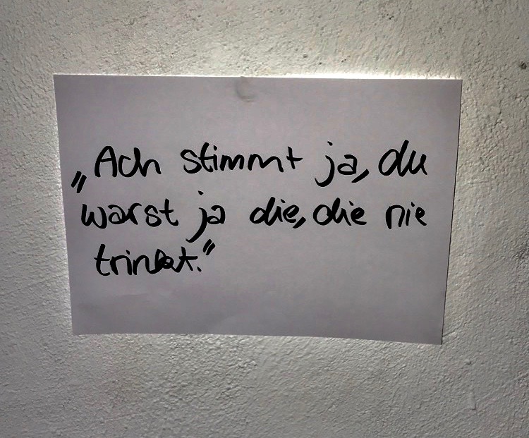 Es geht darum, dass sie viele Menschen sich einfach nicht trauen zuzugeben, dass sie nicht trinken, weil sie deswegen meistens ausgeschlossen oder ausgelacht werden. Es geht um den gesellschaftlichen Druck der entsteht und einen dazu bringt sich zu schämen und einfach zu lügen, weil man sich nicht traut entweder den Grund zu sagen, weshalb man nicht trinkt oder einfach nur allgemein kund zu tun, dass man nicht trinkt. Wenn man zugibt, dass man nicht trinkt erwarten die Menschen meistens eine ganz genaue Erklärung und eine meilenlange Argumentation wieso das jetzt so ist. Aber vielleicht möchte ich einfach nicht genauer erläutern, dass ich nicht trinke, weil ich Antidepressiva nehme oder es mir ganz einfach nicht schmeckt und ich keine Lust darauf habe. Es wird immer weiter nachgehakt und irgendwann beginnt man sich einfach zu schämen.