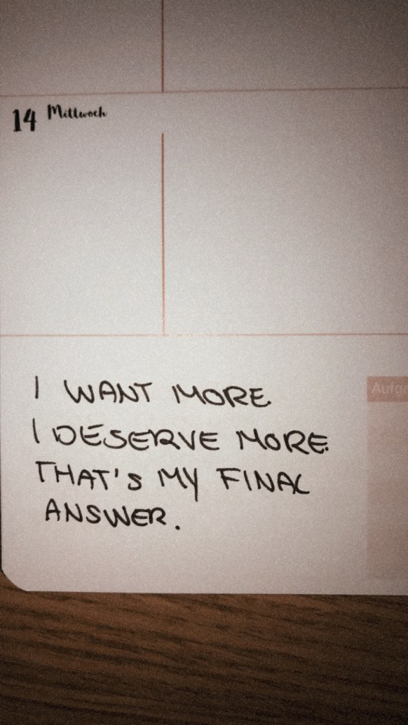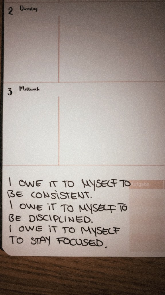 Ich habe mir positive Sprüche in meinen Kalender geschrieben, damit ich sie immer sehe, wenn ich meine To-Dos aufschreibe. Bei mir wirkt es Wunder.