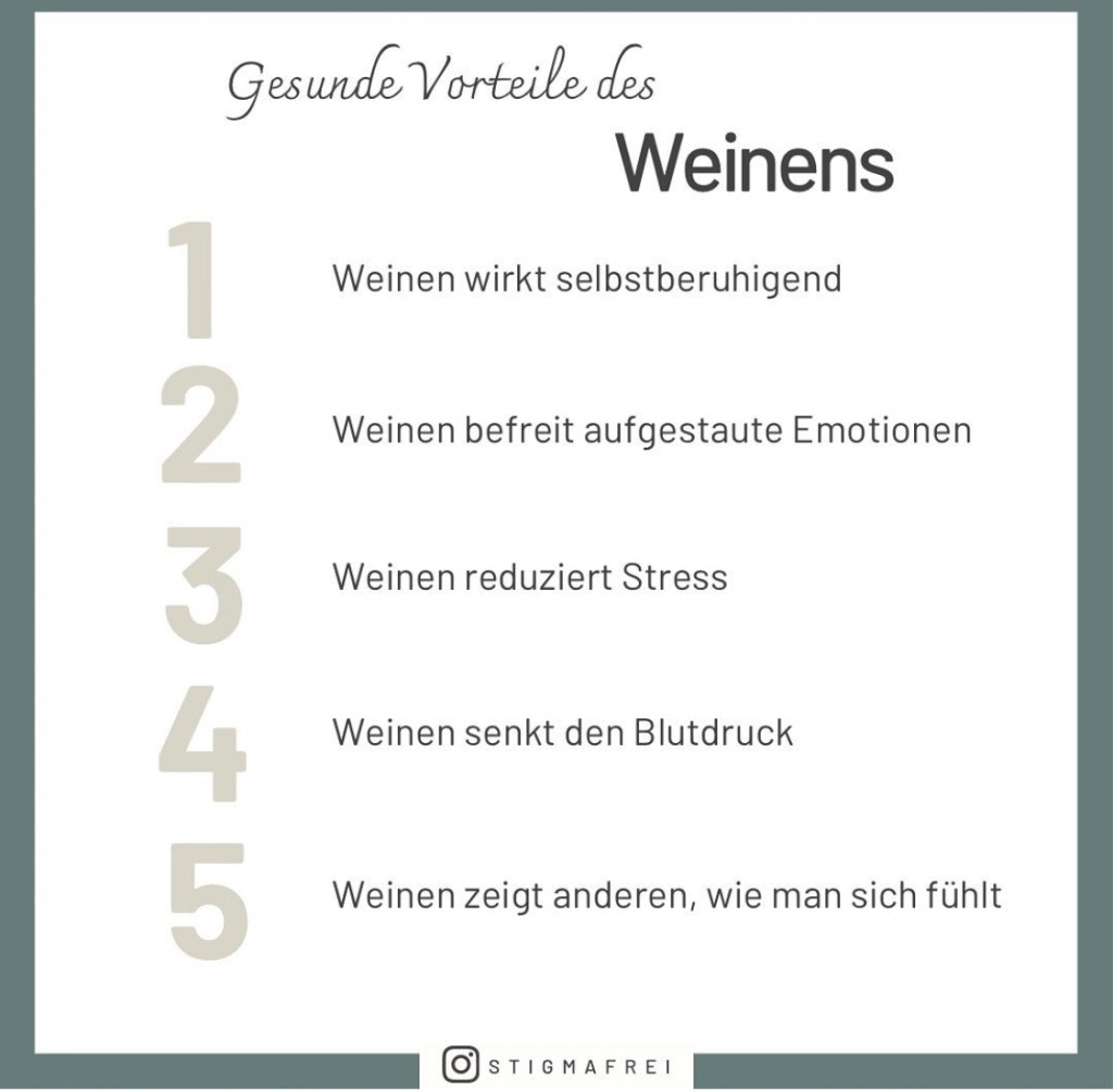 Es ist in Ordnung zu weinen. In der heutigen Gesellschaft wird uns aber genau das Gegenteil davon vermittelt. Wer weint ist ein Verlierer. Wer weint ist schwach. Wer weint erreicht nichts im Leben. Weichei. Memme. Heulsuse.