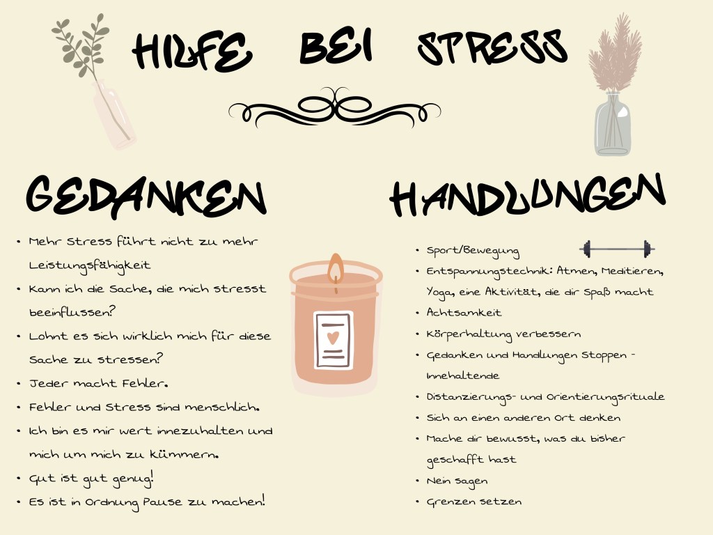 Stress ist also grundsätzlich nichts Negatives. Stress hat in einem gesunden Maß durchaus auch positive Seiten. Wir brauchen einen gewissen Stress, um leistungsfähig zu sein. Vielleicht hilft dieser Gedanke. Stress kann die Leistung erhöhen. Weiß man zum Beispiel, dass man in einer Stunde eine Abgabe hat, dann wird man sich so oder so hinsetzen müssen, um diese Aufgabe zu bewältigen. Hätte man diesen Zeitdruck nicht, hätte man es vermutlich nicht in so kurzer Zeit gemacht.