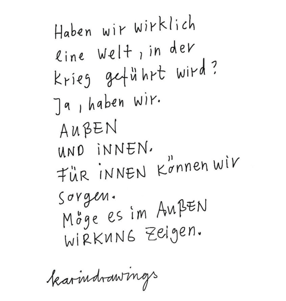 Egal wie oder was du fühlst: Es ist okay. Du darfst alles fühlen. Machtlosigkeit, Trauer, Verzweiflung. Akzeptiere deine Gefühle und lasse Dich auf sie ein. Alles ist okay. Wichtig ist, dass das Gefühl der Machtlosigkeit Dich nicht zum Hassen bringt Denn Hass bringt leider gar nicht weiter und dieser Krieg ist zum Teil auch aus Hass entstanden. Lass uns uns genau gegenteilig zum Hass verhalten und Liebe in der Welt verteilen.