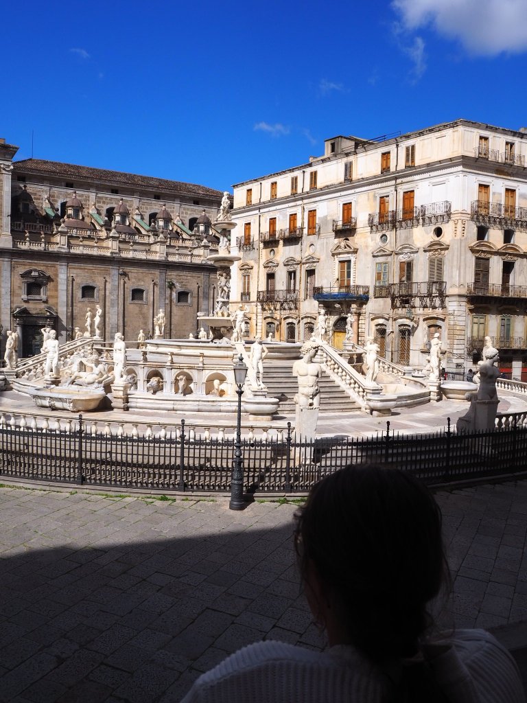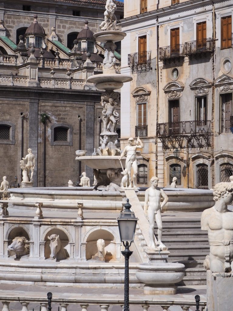 Dieser Brunnen ist ein Wahrzeichen von Palermo. Er wurde von sizilianischen Kirchgängern auch Brunnen der Schande aufgrund der Verzierung mit nackten Nymphen, Tritonen und Flussgöttern. Auch dieser Brunnen befindet sich sehr zentral in der Nähe des Quattro Canti. Es empfiehlt sich auf die Treppen zu steigen, die sich eher seitliche befinden, um eine etwas bessere Sicht auf den Brunnen zu bekommen.