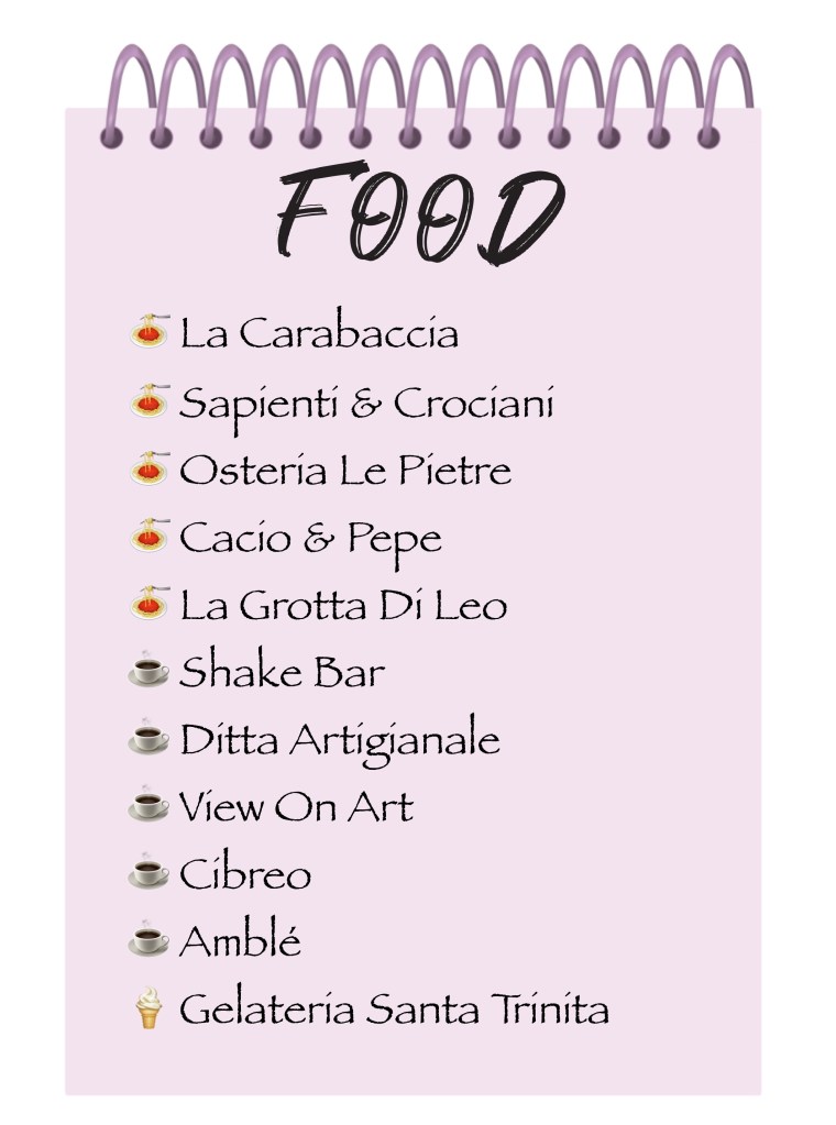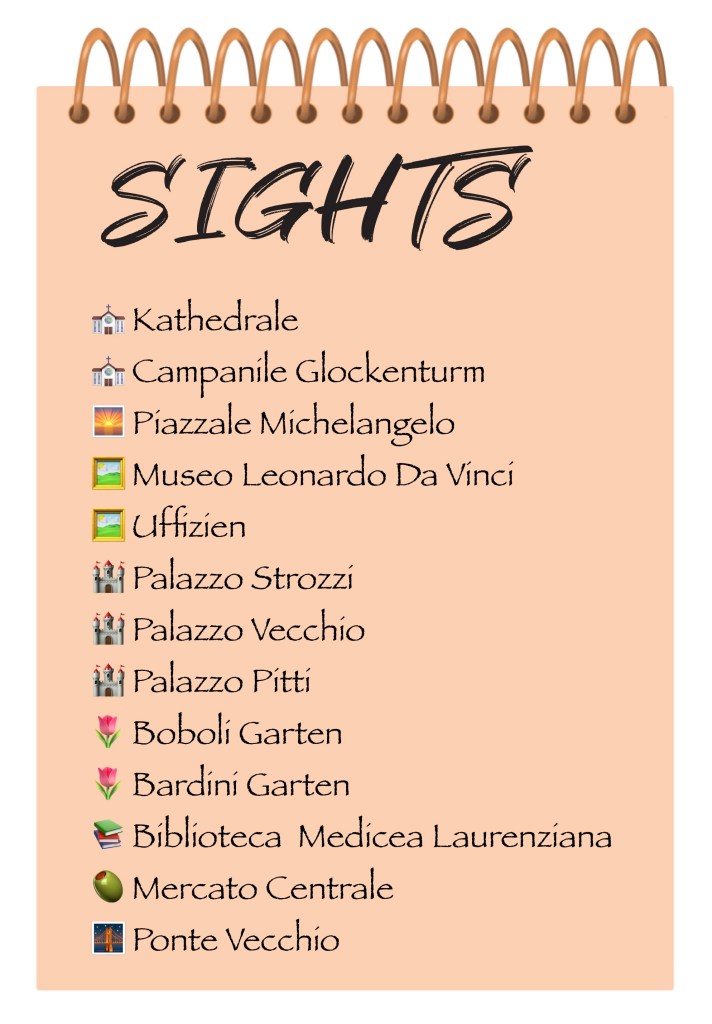 Ich habe hier eine Liste aller Restaurants & Cafés, sowie aller Sehenswürdigkeiten, die wir besichtigt haben. Es gibt natürlich noch viele mehr, zum Beispiel sind noch die Galleria dell’Accademia, das Nationalmuseum Bargello, das Museo dell’Opera del Duomo oder das Archäologische Nationalmuseum sehr bekannt.