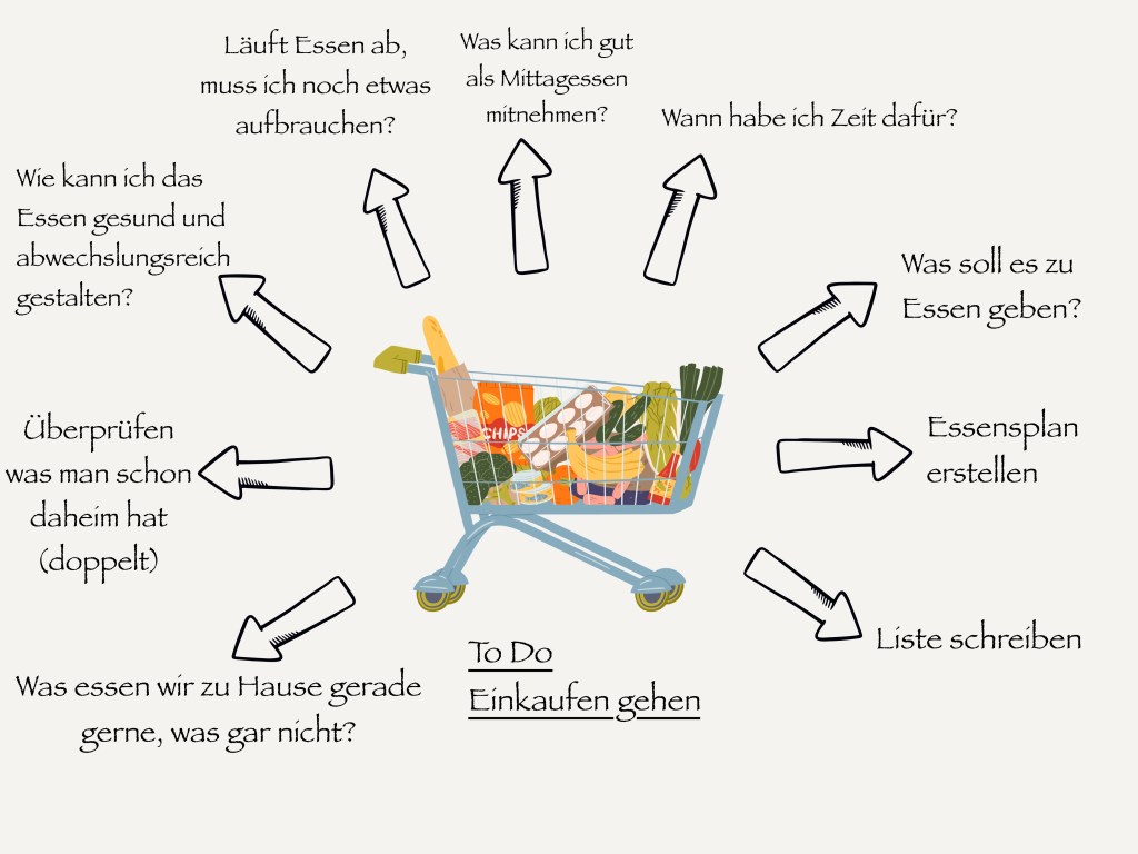 In den wenigsten Fällen wird es so sein, dass man irgendwann einfach in den Supermarkt marschiert, Sachen in den Einkaufswagen schmeißt und dann einfach wieder geht. Viel eher ist es so, dass man sich im Vorfeld einige Gedanken macht. Wann habe ich diese Woche überhaupt Zeit einkaufen zu gehen? Was will ich essen? Habe ich das Budget dazu? Habe ich noch Vorräte, die ich aufbrauchen muss bevor sie ablaufen? Wir komme ich da hin? Bus fahren oder doch lieber mim Rad oder mim Auto? Und so weiter. Das sind wahnsinnig viele Gedanken, also unsichtbare To-Dos, die hinter dieser „simplen“ Aufgabe des Einkaufengehens stecken. Und vor allem viele unsichtbare Aufgaben, die einem ganz schön viel Energie rauben können. So Kleinkram macht das Arbeitsgedächtnis ziemlich voll und raubt Kapazitäten.