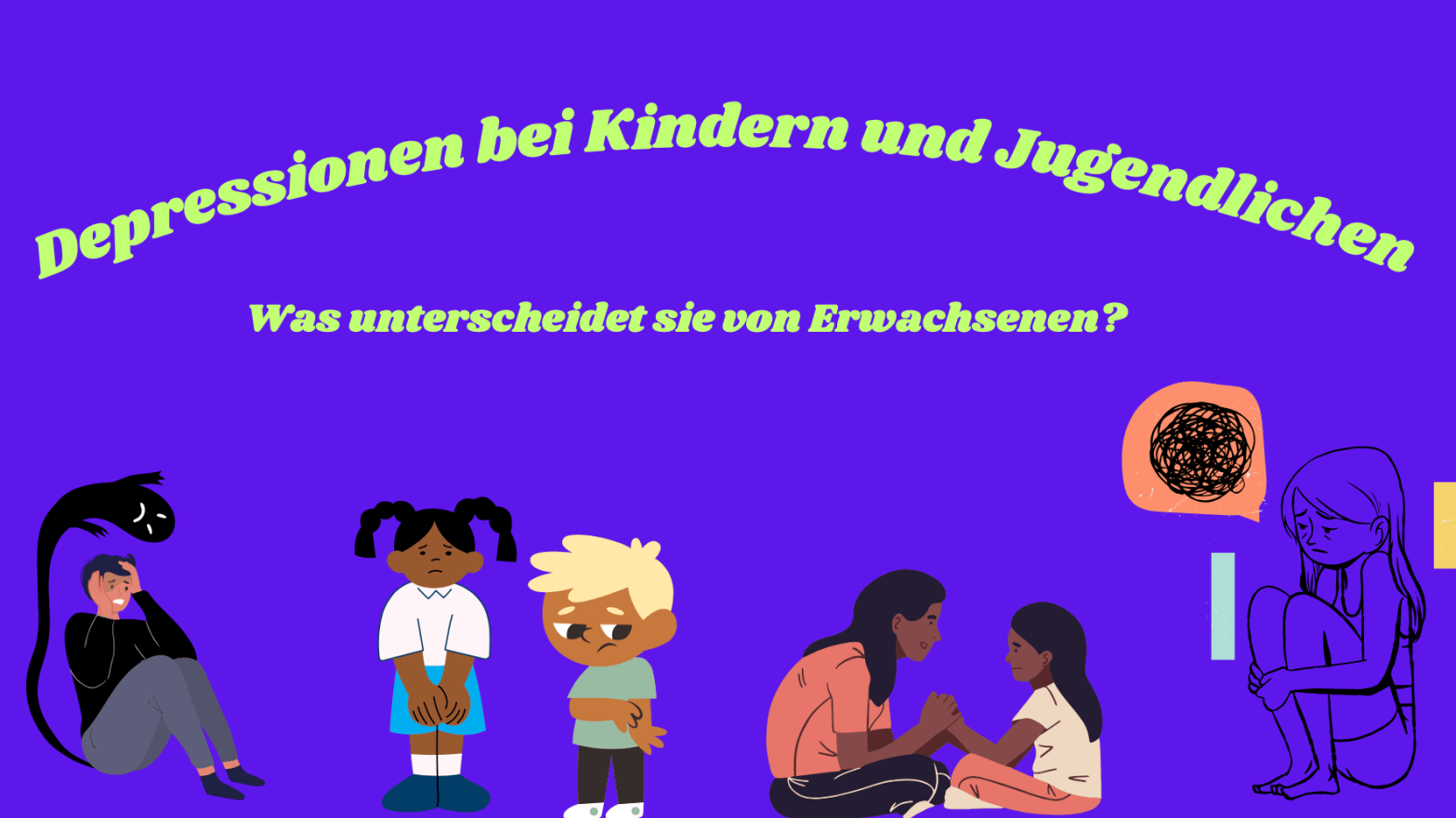 Kinder zeigen im Gegensatz zu Erwachsenen häufiger körperliche Beschwerden, Reizbarkeit und Sozialen Rückzug. Dies ist unter anderem dadurch erklärbar, dass Kinder sich noch nicht so gut ausdrücken können und ihnen auch Lebenserfahrung fehlt, wodurch sich die Symptome auf den Körper verlagern (z.B. Bauchweh, Kopfweh, Übelkeit etc.). Bei Jugendlichen sind es eher die Psychomotorische Verlangsamung, Hypersomnie (zu viel Schlaf) und Wahnphänomene sein.