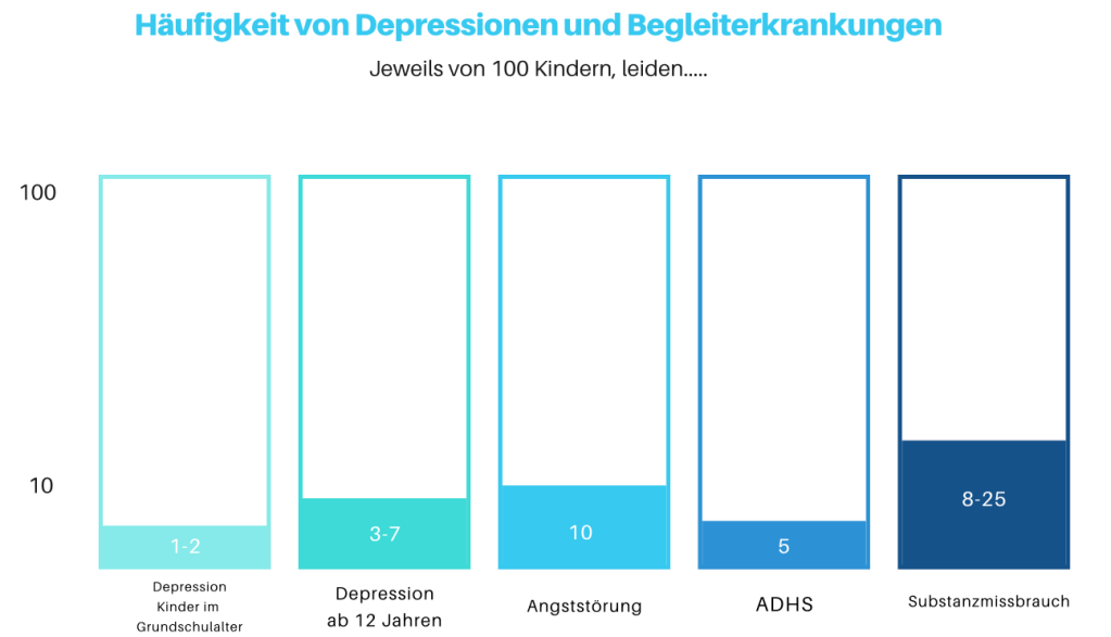 - Die Depression tritt oft nicht alleine auf. Häufig gibt es Begleiterkrankungen wie ADGS, Angststörungen, Essstörungen, Substanzmissbrauch etc.