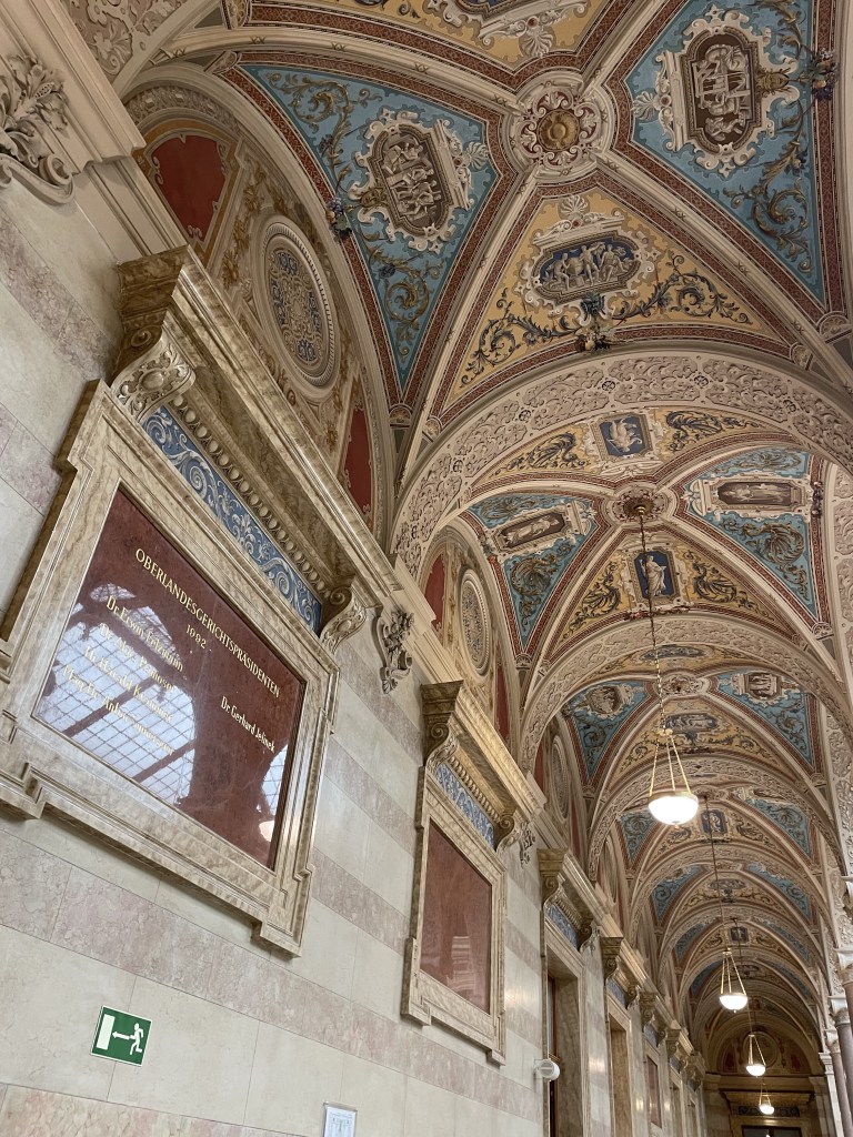 Wenn du zwischendrängen noch ein bisschen Sightseeing machen möchtest, ist dann der Justizpalast ganz in der Nähe. In die Aula kommt man gratis und außerdem hat man Zugang zu einer Dachterasse mit einem richtig tollen Blick auf die Innenstadt. Dort gibt es sogar eine Mensa mit nicht all zu teuren Preisen.